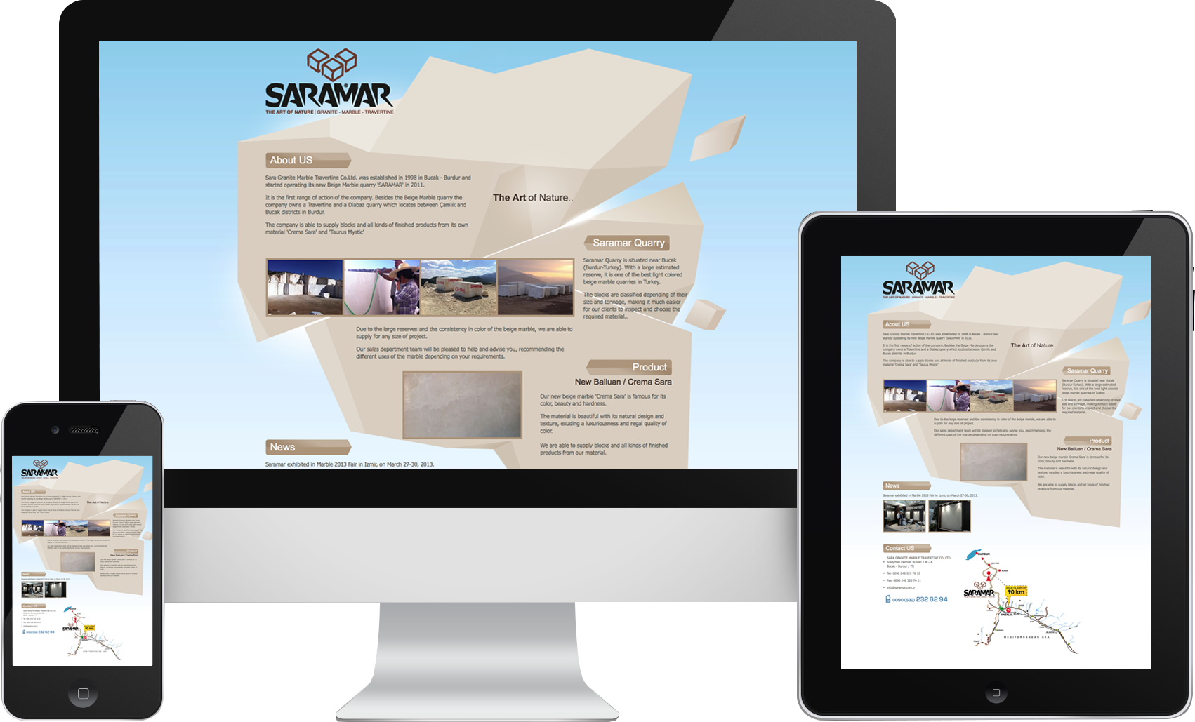 The art of nature sloganı ile doganın dokusundan elde edilen kaliteli mermerleri dünyaya tanıtan bir firmadır. Sara Granit Mermer Traverten Ltd.Şti. 1998 yılında Bucak - Burdur'da kuruldu ve yeni Bej Mermer ocağı 'SARAMAR' 'ı 2011 yılında faaliyete geçirdi. Şirketin ilk faaliyet alanıdır. Bej Mermer ocağının yanı sıra Burdur'daki Çamlık ve Bucak ilçeleri arasında yer alan Traverten ve Diabaz ocağı da bulunuyor. Şirket kendi materyali 'Crema Sara' ve 'Toros Mistik' 'ten bloklar ve her türlü bitmiş ürün tedarik edebiliyor.